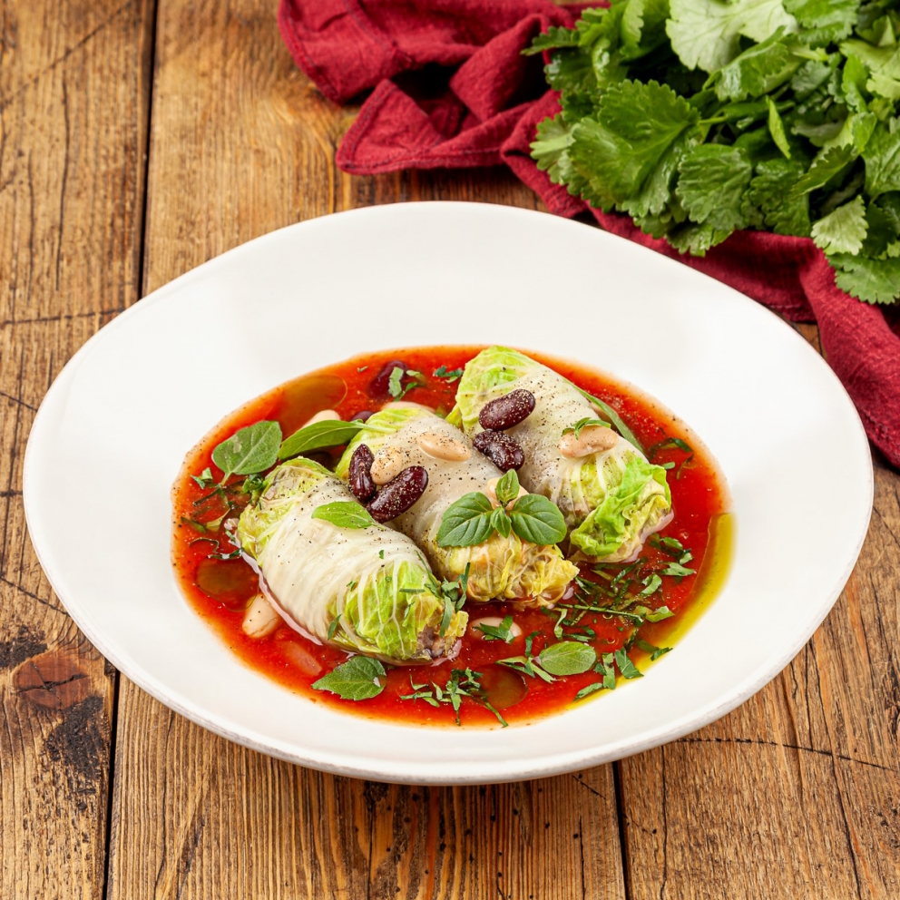 Овощные голубцы из капустных листьев, фаршированные фасолью, морковью и болгарским перцем, с добавлением мини-базилика и петрушки