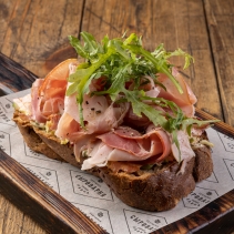 Брускетта на свежем хлебе с тамбовским окороком, салатом айсберг, пряной руколой, редисом и свежим огурцом