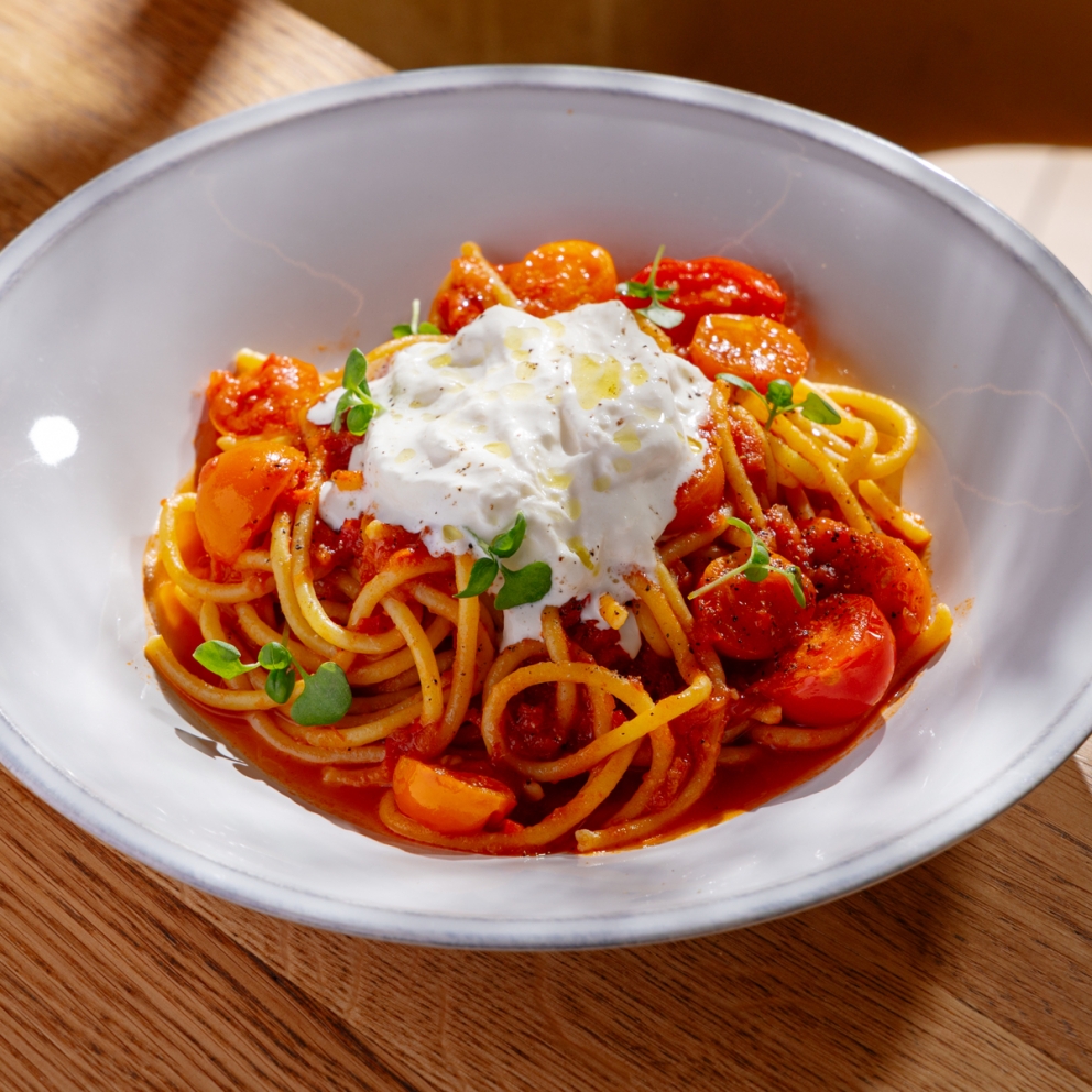 Домашняя паста с традиционным итальянским томатным соусом арабьята и Страчателлой