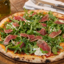 Пицца из дровяной печи со Страчателлой, слайсами вяленой утки, Пармезаном и руколой