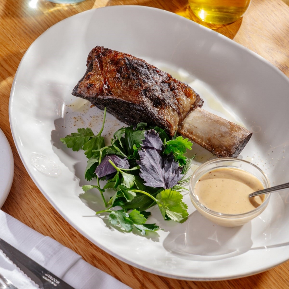 Томленое говяжье ребро с перечным соусом и миксом зелени
