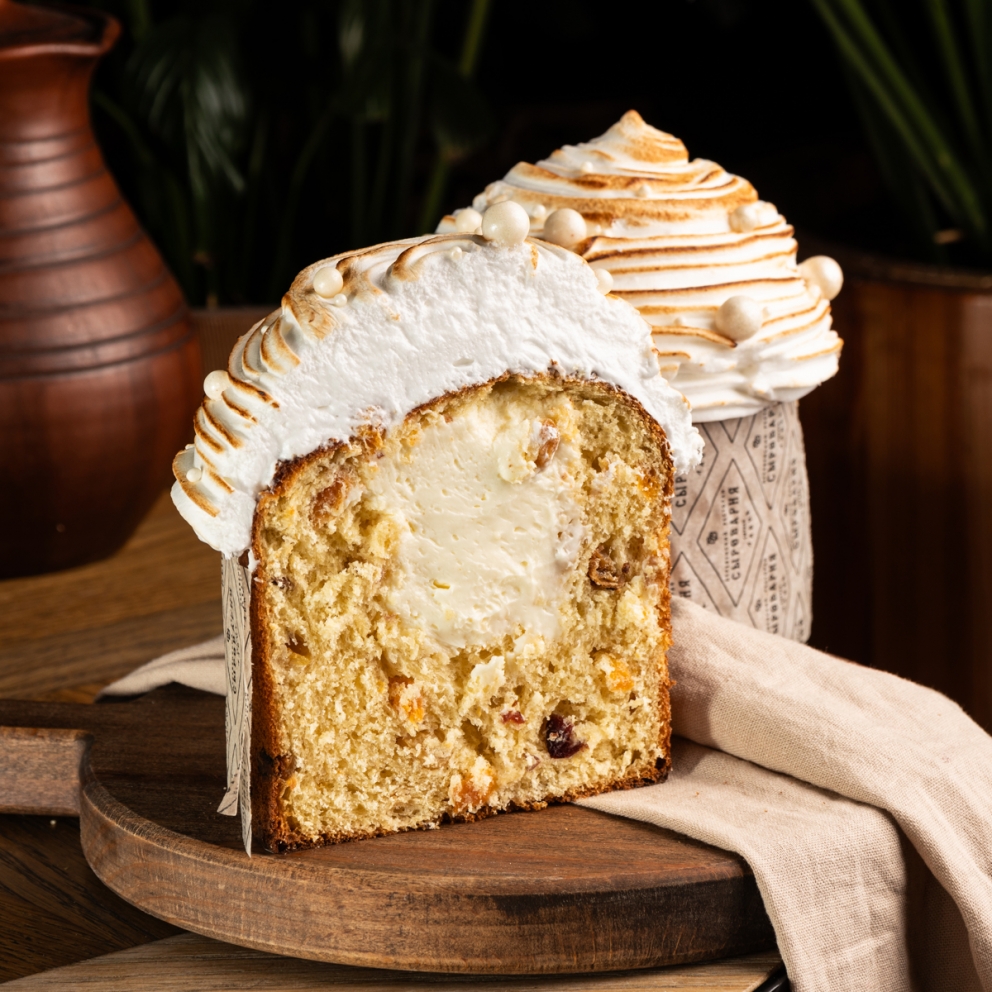 Ароматный сдобный кулич с цукатами и нежной сырно-сливочной начинкой, украшенный пышной меренгой и кондитерской посыпкой