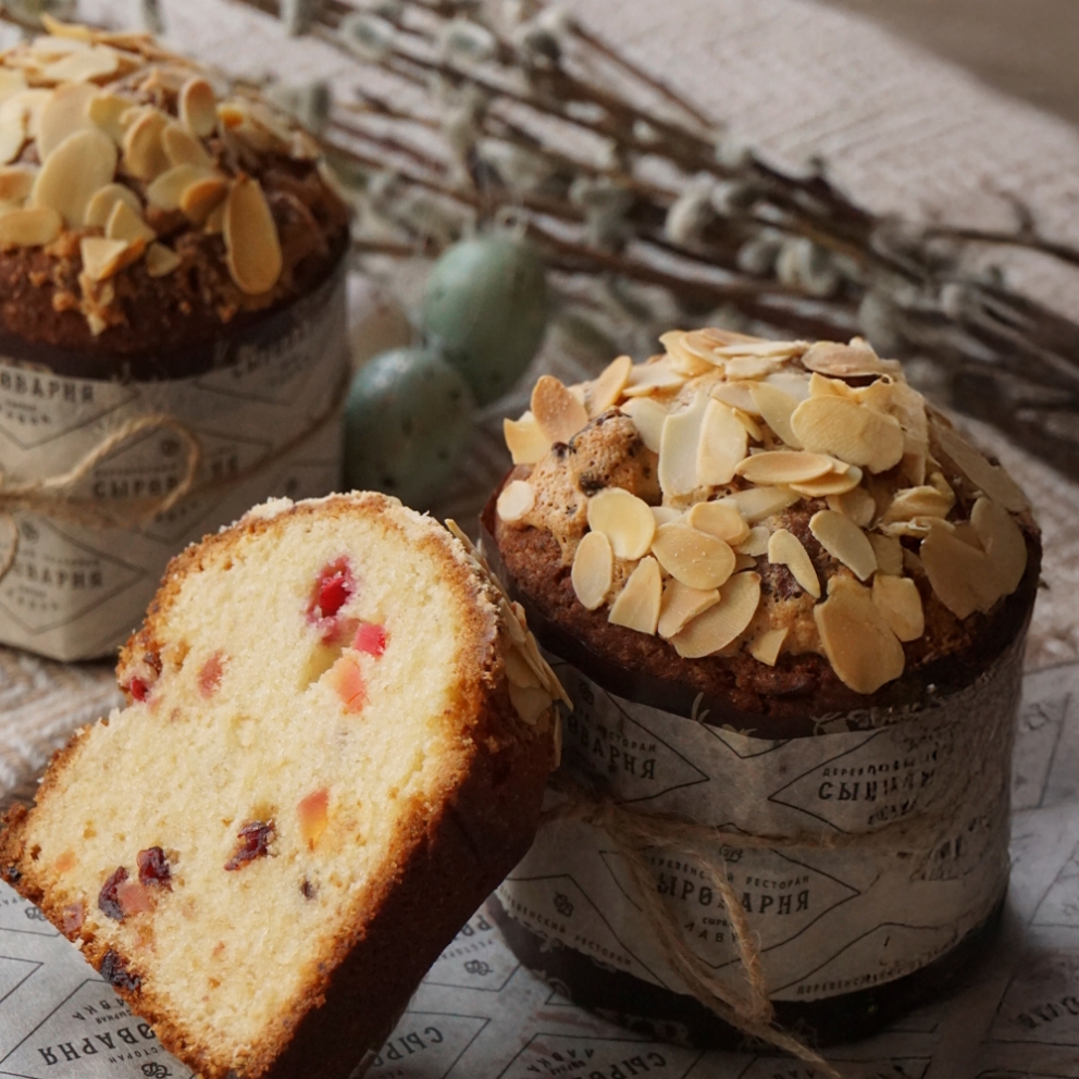 Творожный кулич с миндальной глазурью, добавлением цукатов, свежей и вяленой клюквы
