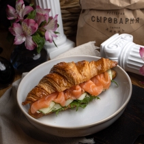 Круассан со слабосоленым лососем, сливочно-лаймовым кремом, свежим огурцом и руколой