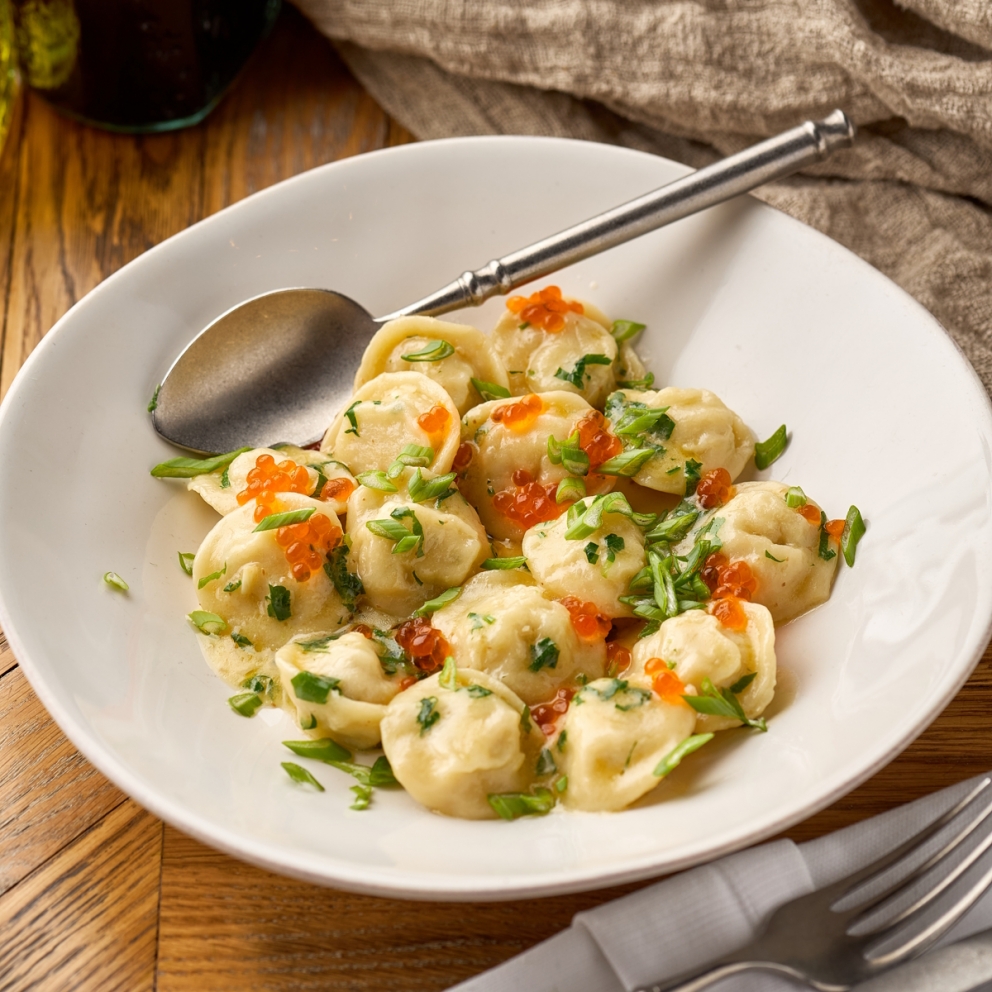 Пельмени, фарш из щуки, красная икра, масло сливочно-чесночное, лук, масло сливочное