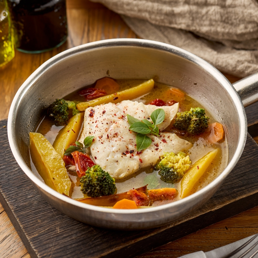 Дорадо, брокколи, вяленые томаты, картофель, сливочное масло, морковь, перец, соль, чеснок, масло зеленое
