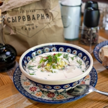 Классическая окрошка на айране с томленой говядиной, овощами и ароматной свежей зеленью