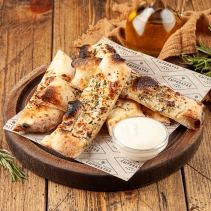 Фокачча выпеченная (мука пшеничная в/с, вода, масло оливковое, дрожжи, соль морская), соус трюфельный (сливки 33%, сыр моцарелла для пиццы, сыр пармезан, масло оливковое с трюфелем, перец горошек молотый), масло ароматное (масло оливковое, чеснок, тимьян свежий, розмарин свежий ), сыр пармезан, соль морская, перец горошек молотый
