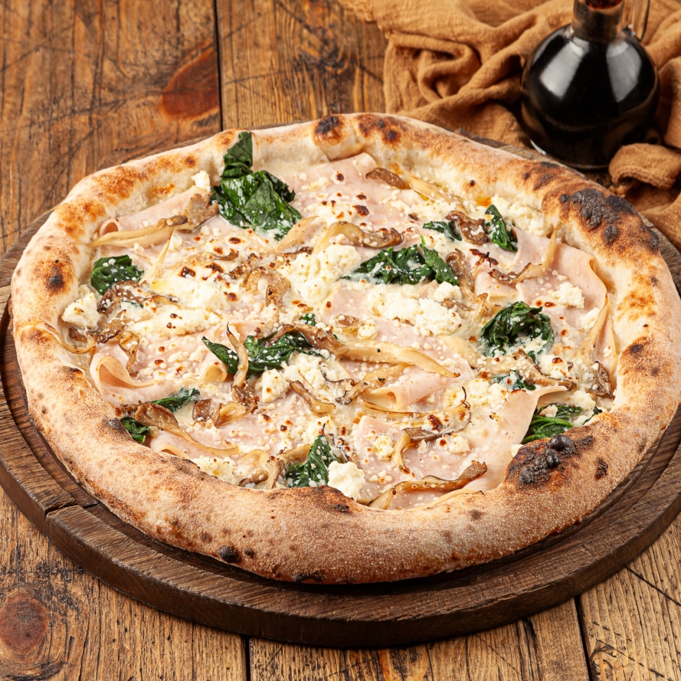 Пицца из дровяной печи с индейкой, сыром Рикотта, трюфельным маслом, вешенками и оливковым маслом