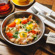 Яичница из трех яиц с беконом, помидорами, луком и ароматной зеленью