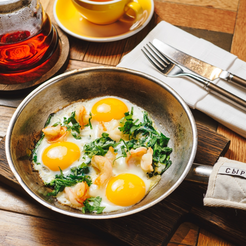 Соль, масло растительное, масло сливочное, яйцо куриное, зелень, шпинат свежий, креветки, специи