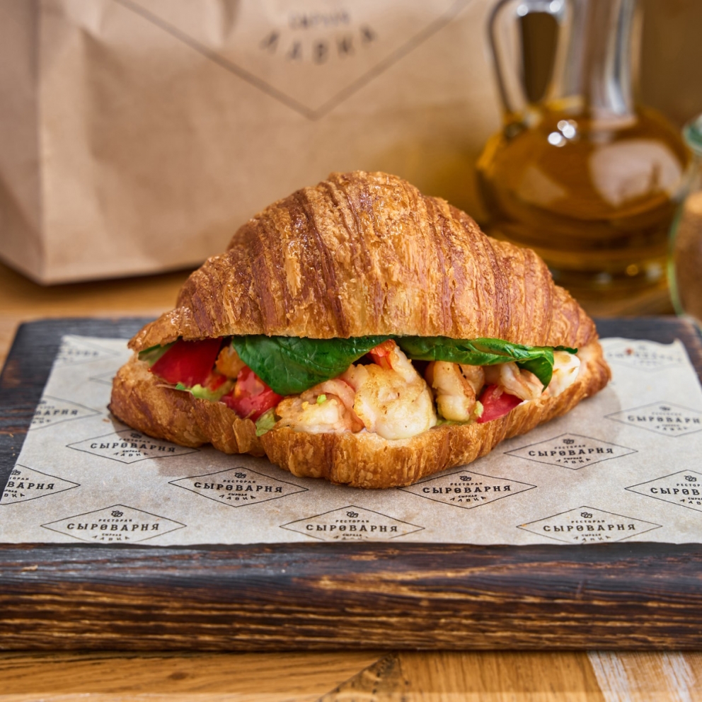Классический круассан из слоеного теста на сливочном масле с гуакамоле, тигровыми креветками, листьями салата, шпинатом и томатами