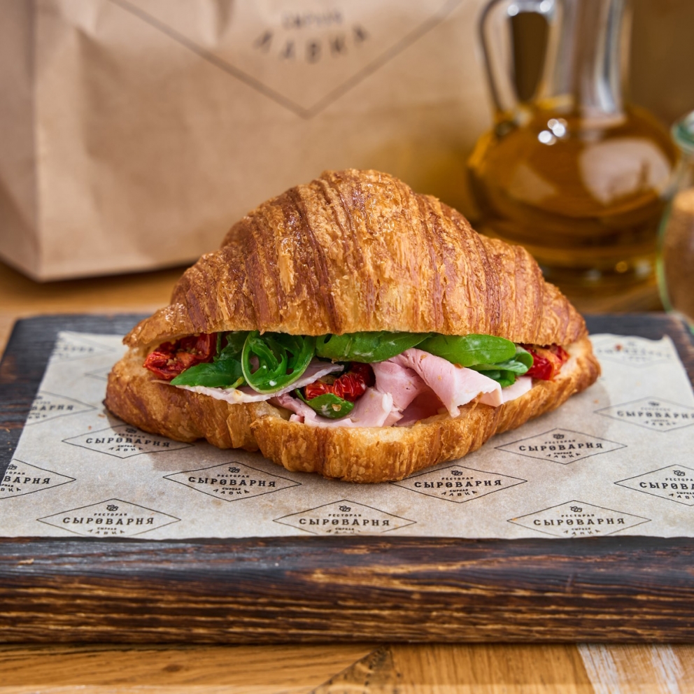 Классический круассан из слоеного теста на сливочном масле с тамбовским окороком, трюфельным майонезом, листьями пряной руколы и вялеными томатами