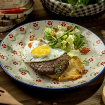 Картофельный драник с говяжьим бифштексом, миксом зелени, яйцом и томатами конкассе