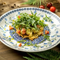 Картофельный драник с обжаренными креветками в соусе песто, салатом рукола и томатами конкассе