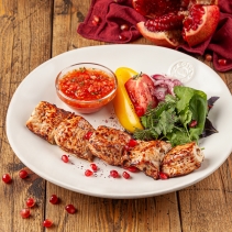 Приготовлено на гриле- шашлык (индейка филе, кефир 3,2%, соус соевый, масло подсолнечное рафинированное, соль морская , кавказские травы (кинза, петрушка, сельдерей, базилик, чабер садовый), перец горошек молотый), гарнир из овощей и зелени (помидоры узбекские, перец болгарский, лук красный маринованный (лук красный крымский, уксус столовый, укроп, сахар песок, соль морская), соус аджика (помидоры, перец болгарский, лук репчатый, чеснок, кинза, уксус винный, соль морская, сахар песок)