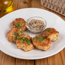 Котлеты из мяса птицы обжаренные (курица бедро, яйцо куриное, майонез, сыр скаморца, мука пшеничная в/с, соль морская, петрушка свежая, чеснок), соус грибной (грибы шампиньоны обжаренные, сливки 33%, лук репчатый, масло подсолнечное, соль морская, тимьян, перец черный), масло подсолнечное, сливки 33%, петрушка