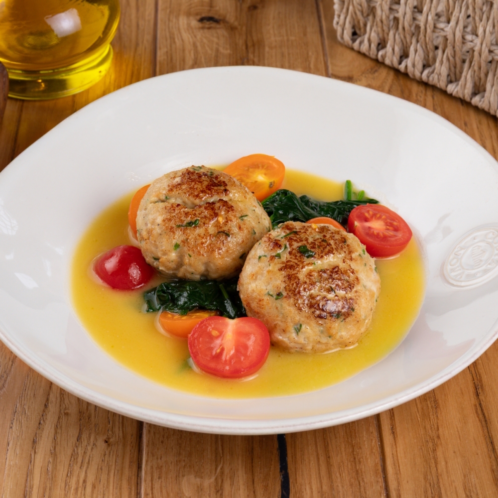 Котлеты из филе щуки обжаренные (щука филе, лук репчатый, масло подсолнечное, яйцо куриное, сливки 33%, петрушка, соль морская, перец черный), шпинат, помидоры черри, масло сливочное, масло подсолнечное, соль морская