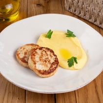 Котлеты из мяса птицы обжаренные (индейка филе, масло сливочное, сливки 33%, яйцо куриное, соль морская, перец черный), пюре картофельное (картофель отварной, сливки 33%, молоко 3,2%, масло сливочное, соль морская), масло подсолнечное, масло оливковое, петрушка