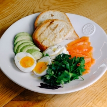 Хлеб пшеничный, мусс рикотта, авокадо, лосось с/с, яйцо куриное, микс листьев, перец горошек, масло оливковое