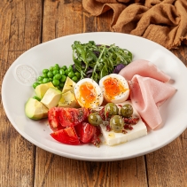 Яйцо всмятку с сыром Чанах, узбекскими томатами, Мортаделлой и авокадо