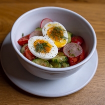 Помидоры, огурцы, масло оливковое, яйцо куриное, редис красный, соль морская, укроп, перец черный