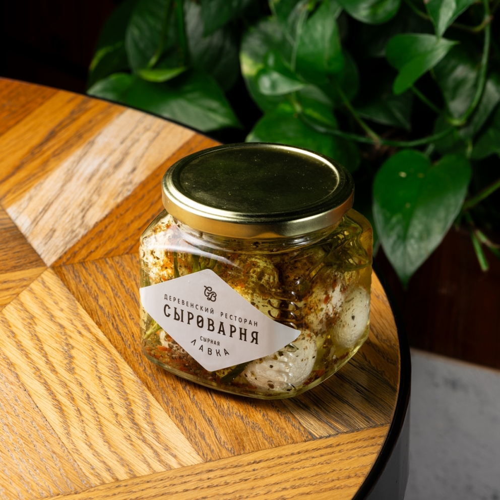 Шарики нежного творожного сыра из коровьего молока, маринованные в оливковом масле со специями и розмарином