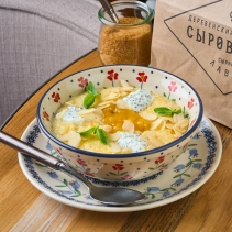 Пшено, молоко, джем манго, крем творожный (молоко, творог, сахарная пудра), семена чиа, масло сливочное 82%, лепестки миндальные
