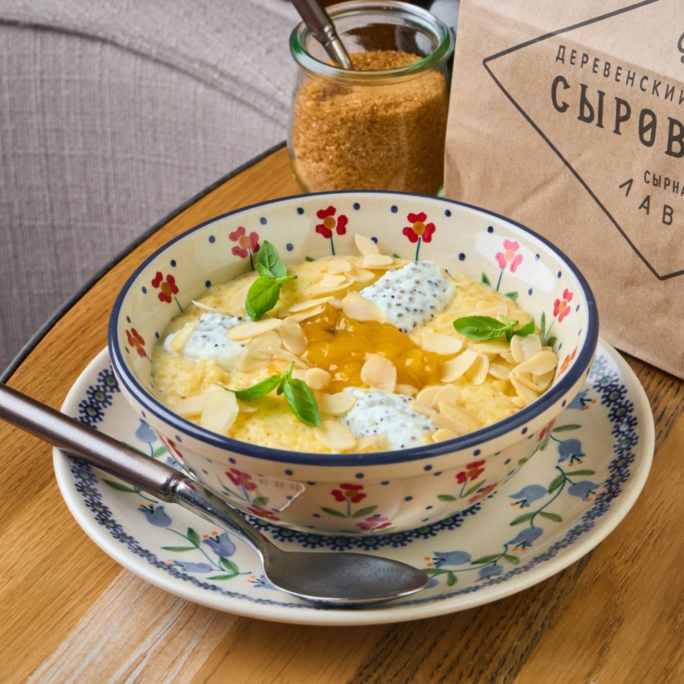 Пшенная каша на молоке с творожным кремом, джемом из манго, лепестками миндаля и семенами чиа