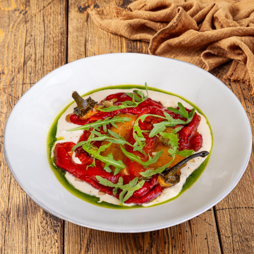 Маринованные перцы с соусом вителло тоннато, каперсами, руколой и зеленым маслом