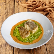 Палтус, паста орзо, пармезан, соус шпинат, сливки, соус биск, масло оливковое, цедра лайма
