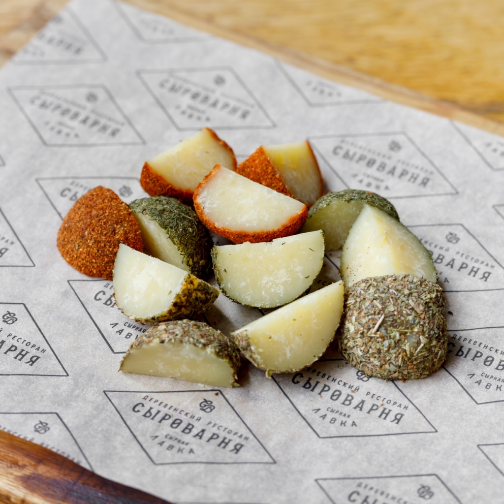 Cыр в форме маленьких шариков в обсыпке из черного перца, прованских трав и паприки