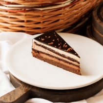 Бархатный муссовый торт на шоколадном бисквите с тремя слоями шоколада: темным, молочным и белым. Украшается темной глазурью с хрустящим пралине