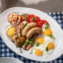 Яйцо, бекон, молодой картофель, помидоры, фасоль, соус горчичный, купаты, сосиски, соус томатный