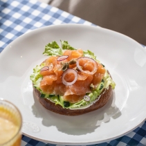 Бейгл со взбитым сыром, хрустящими листьями салата, нежным лососем и свежим огурцом. Украшается каперсами и красным луком