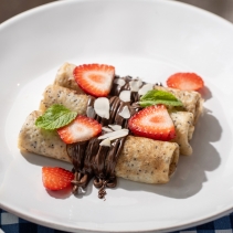 Блины, клубника, нутелла, лепестки миндаля, мята