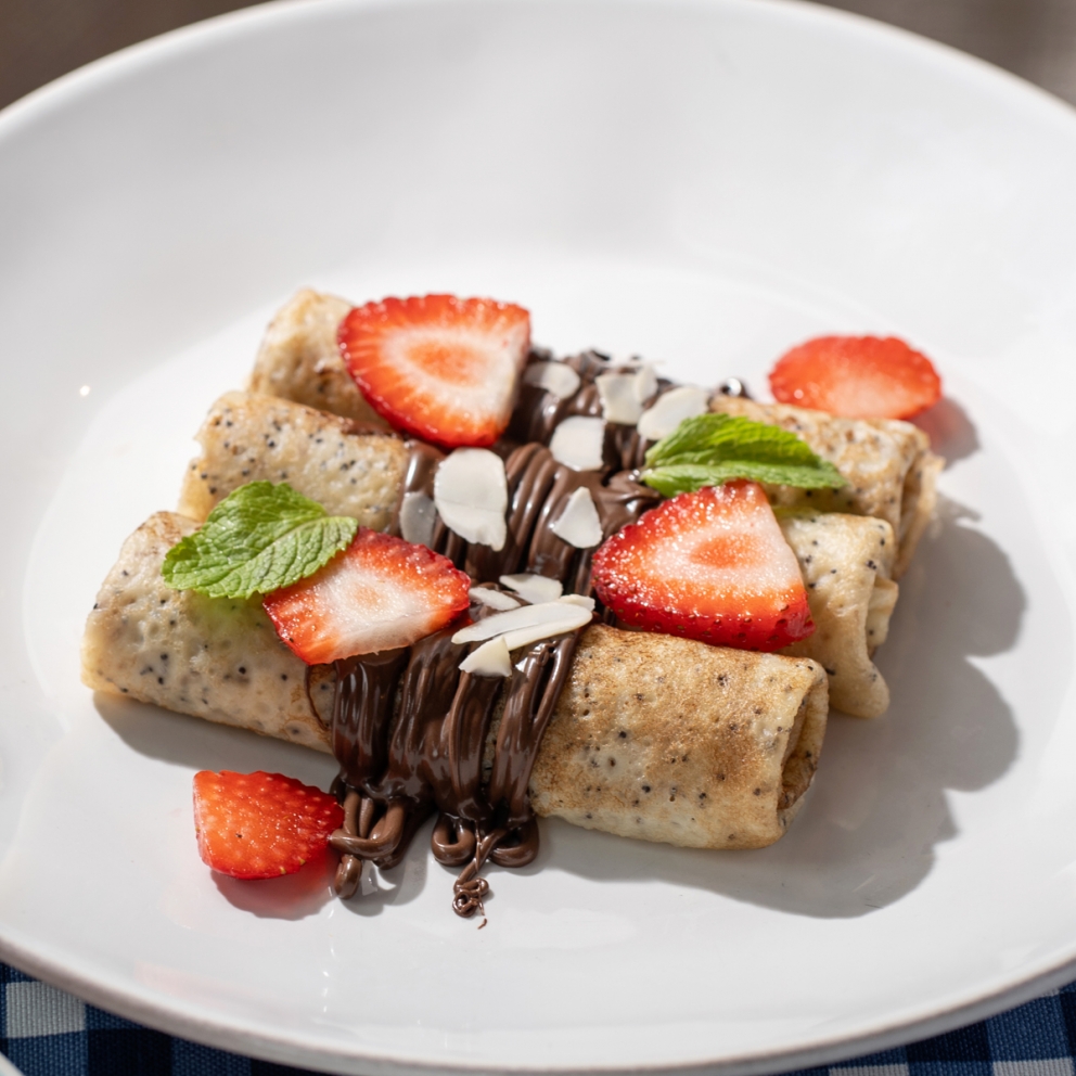 Блины из пшеничной муки с Нутеллой, украшенные свежей клубникой, миндалем и мятой