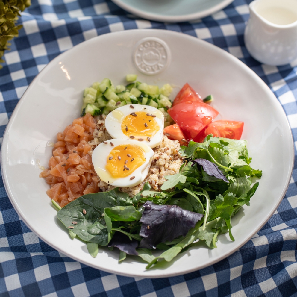 Киноа, огурцы, помидоры, слабосоленый лосось в соусе понзу с руколой и яйцом