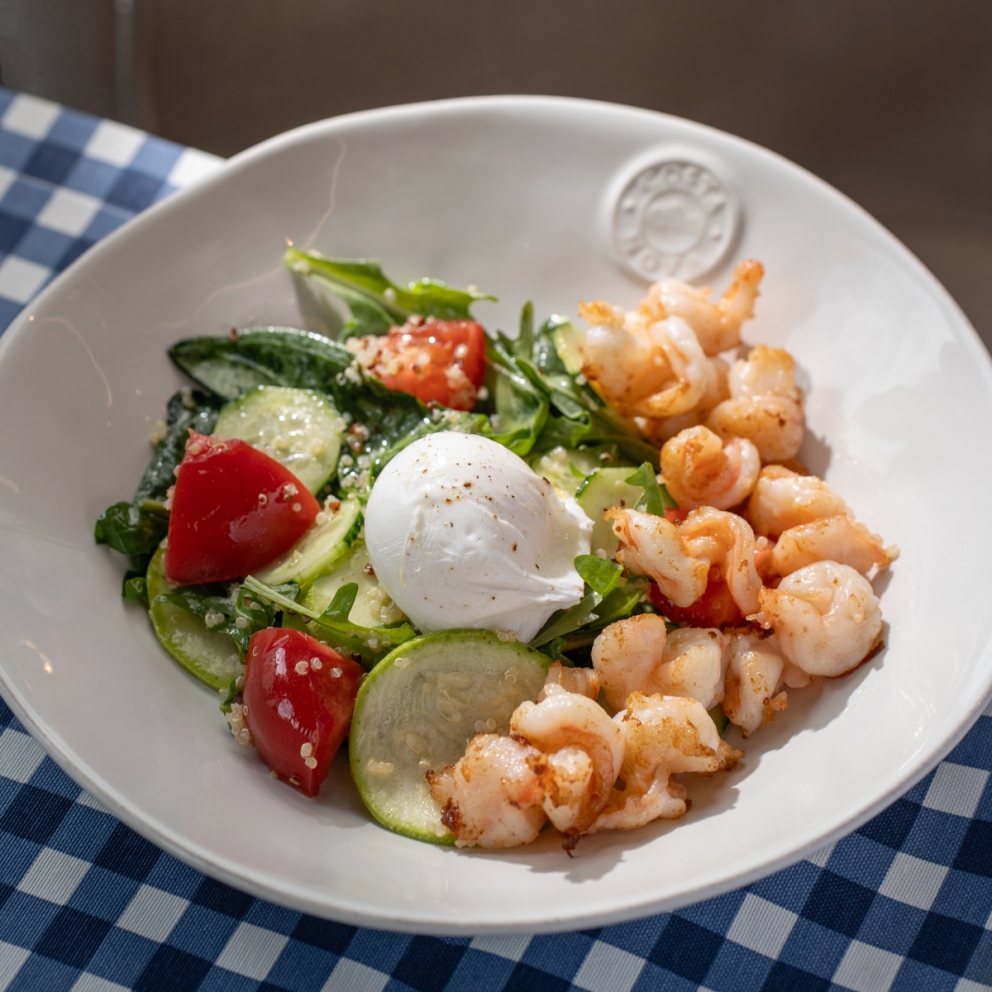 Яйцо, огурцы, помидоры, рукола, шпинат, кабачки, киноа, креветки, лимонно-медовая заправка