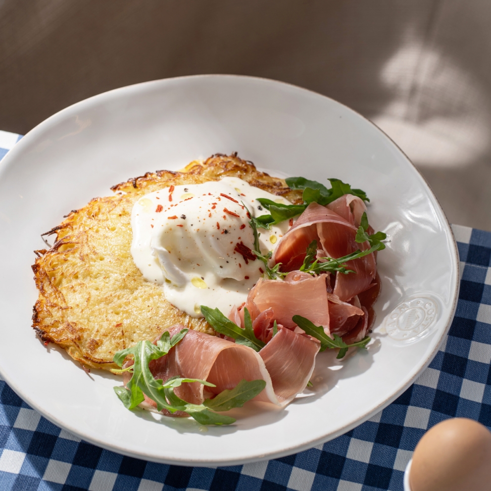 Хрустящие картофельные драники с мягким яйцом пашот, воздушным муссом из Пармезана и тонкими слайсами прошутто