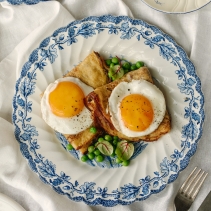 Блины с начинкой из рубленого говяжьего и свиного фарша с глазуньей, зеленым горошком и свежей зеленью