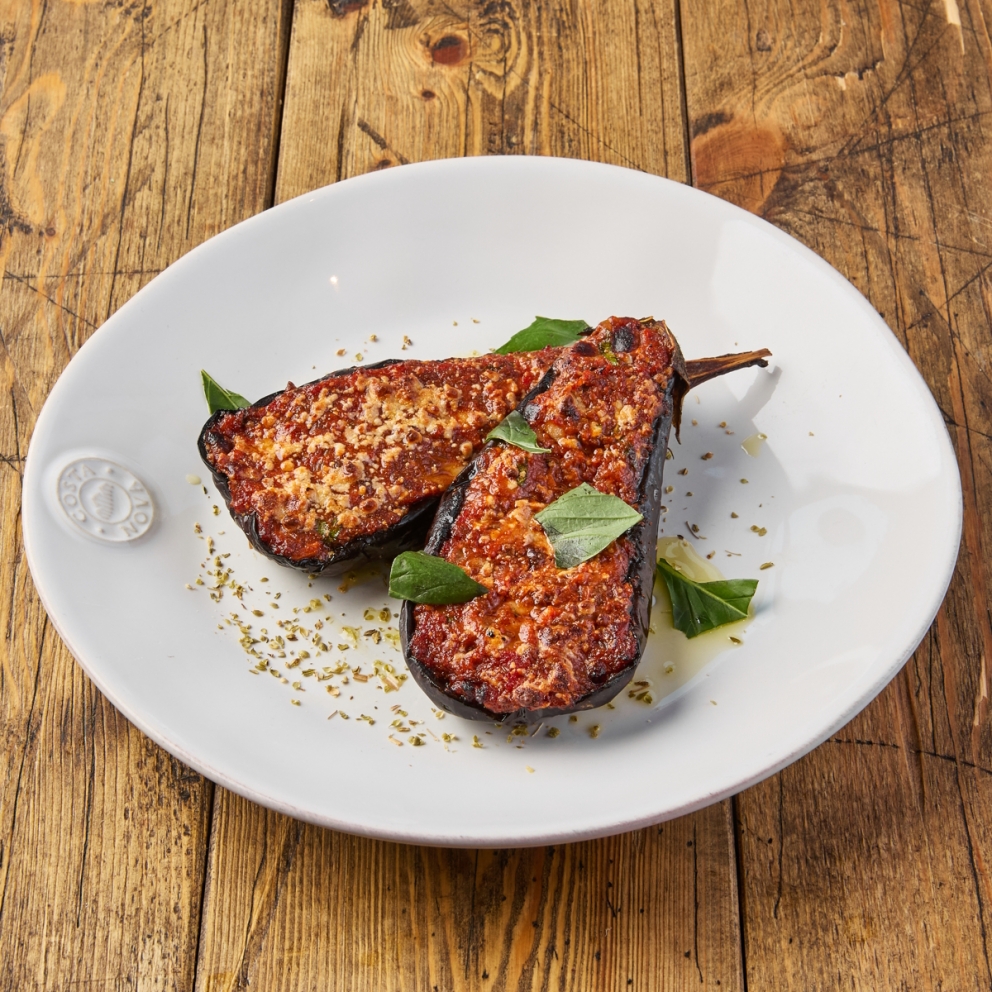 Баклажаны, масло подсолнечное, масло чесночное (масло подсолнечное, чеснок), петрушка, кинза, соль морская, перец черный, соус болоньезе (помидоры в собственном соку , говядина лопатка, лук репчатый, масло подсолнечное, морковь, вино красное, стебель сельдерея, паста томатная, соль морская, чеснок, розмарин, перец черный, тимьян, мускатный орех), сыр моцарелла для пиццы, сыр пармезан, масло оливковое, базилик-мини, орегано сухой сухой