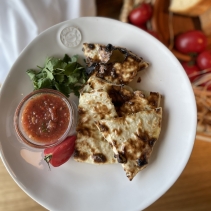 Лепешка из дровяной печи со Скаморцей, брынзой, ароматной зеленью, долькой томата и аджикой