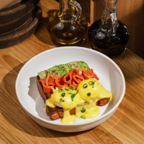 Бриошь, авокадо, нерка слабосоленая, яйцо куриное пашот, соус голландез, масло оливковое, перец горошек молотый/дробленый, лук зеленый, масло сливочное, смесь ореховая (орех кешью, орех фундук, орех грецкий, семена кунжута, семена льна, семена чиа)