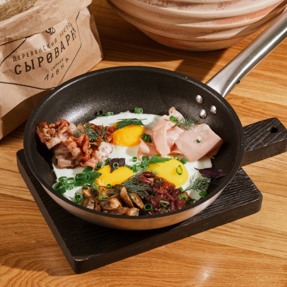 Обжаренные яйца с беконом, мортаделлой, шампиньонами, фасолью, зеленым луком, петрушкой и молотым перцем