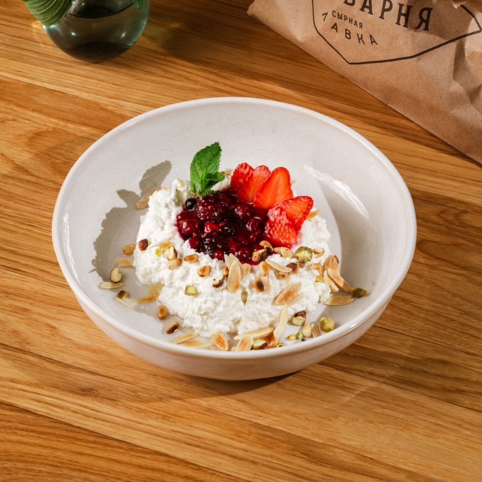 Домашний творог с сезонными ягодами и орехами