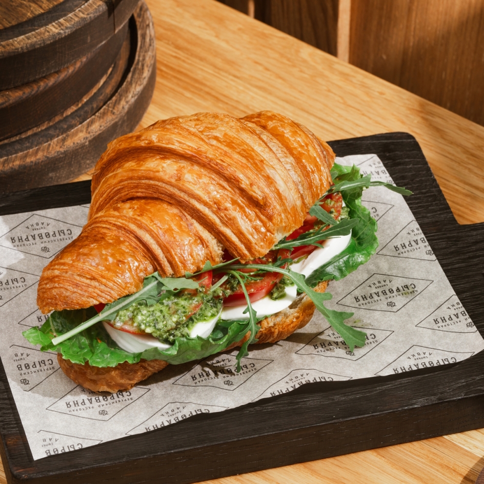 Классический круассан с домашней Моцареллой, узбекскими томатами и соусом песто