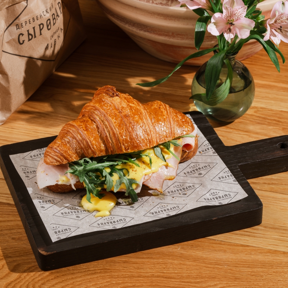 Классический круассан с тамбовским окороком, козьим муссом, руколой и соусом голландез