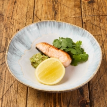 Лосось, соус гуакамоле (авокадо мякоть, помидоры вяленые в масле, сок лимона, соль морская, перец чили), лимоны, масло подсолнечное рафинированное, зелень кинза, соль морская, масло оливковое