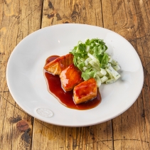 Нежное филе лосося под соусом терияки с гарниром из свежего огурца и соусом из йогурта, мяты и кинзы